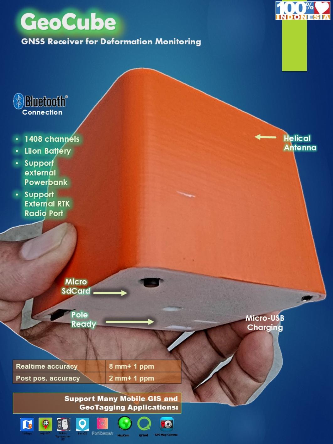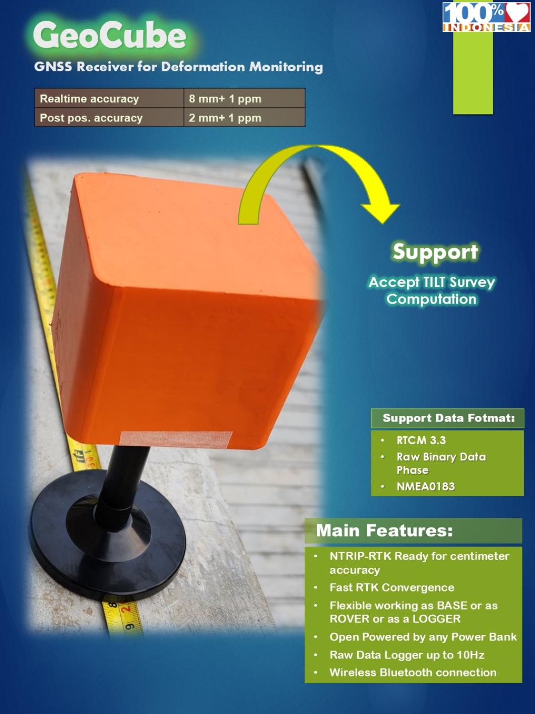| Karakteristik yang menonjol dari sistem GeoCube ini adalah: a. Desain bentuk yang kompak, berukuran kecil sehingga memiliki portabilitas tinggi b. Data flow dari sistem ini bersifat terbuka sehingga mudah di integrasikan dengan sistem lain (inter-operability) c. Termasuk dalam kategori low-cost GNSS dan menggunakan software open source d. Terdapat program dashboard yang memudahkan visualisasi data dalam GIS (Geography Information System) |